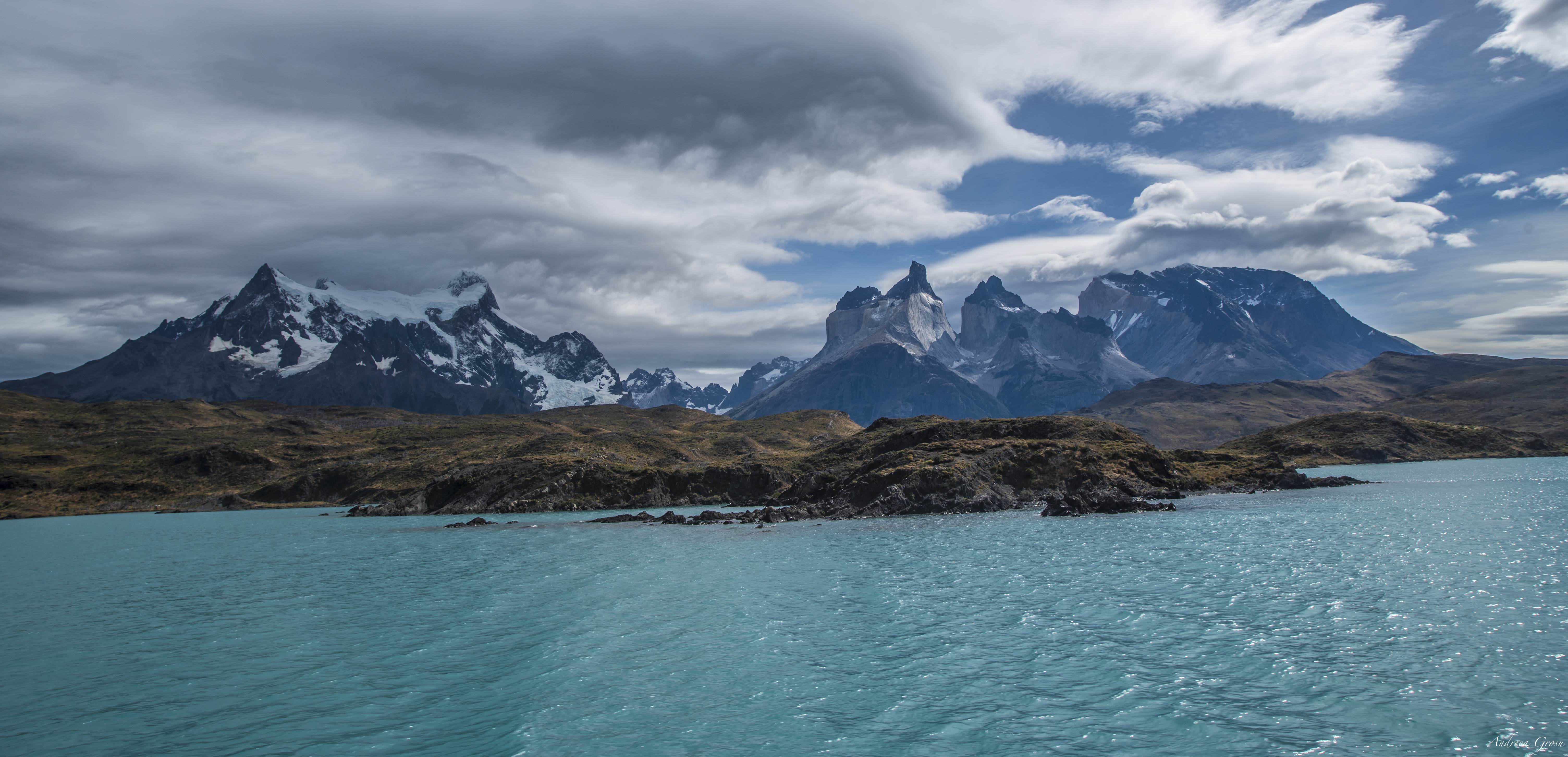 From left to right Cerro Paine Grande, Cuernos del Paine and Monte Almirante Nieto as seen from the catamaran.